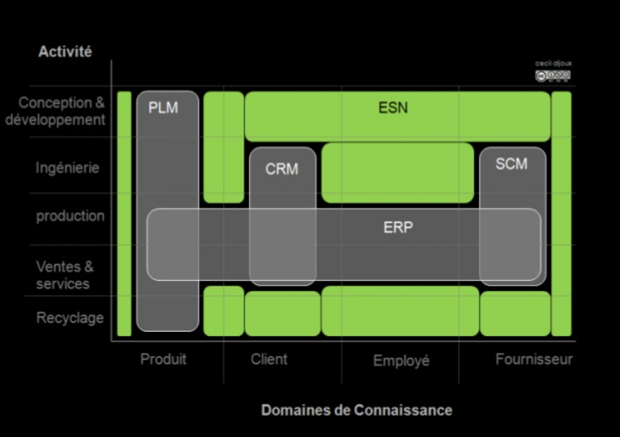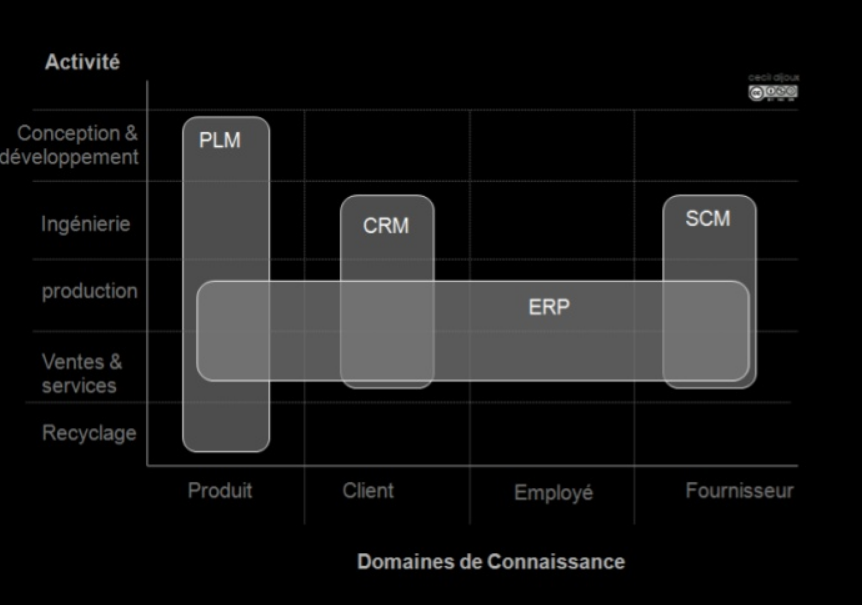 Dans un but pédagogique, il est modifié ici pour illustrer une problématique essentielle de l’entreprise qui n’apparait pas ici : la gestion du savoir tacite non capturé. Ainsi a été réduite la largeur des colonnes (PLM, CRM, SCM) et de la ligne (ERP) pour mettre en évidence le fait que ces systèmes ne couvrent pas l’intégralité de leur domaine de compétence.