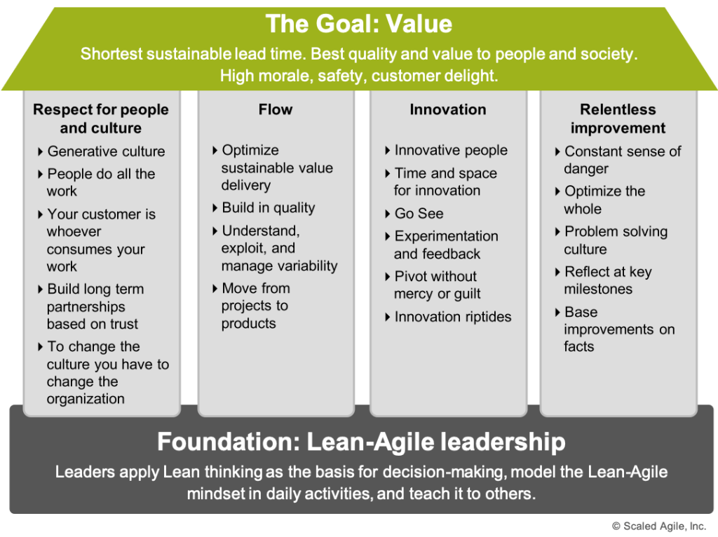 Les points suivants sont les quatre piliers. Le premier est Respect for People and Culture. On retrouve ici un pilier du Toyota Way (Respect for People) et un terme rarement utilisé dans le Lean : Culture. Le Respect for People du Lean est magnifiquement illustré par cette citation de Fuijo Cho : Go See, Ask Why, Show Respect. Il s’agit de pratique de managers et dirigeants qui incitent à aller sur le terrain pour voir les faits tels qu’ils sont ; demander pourquoi aux équipes pour les challenger et solliciter leur expertise sur le sujet ; et montrer du respect en s’intéressant vraiment à leurs problèmes (et les actions d’amélioration menées), ce en n’utilisant que la forme interrogative, sans ne jamais apporter de solution packagée [par exemple : SAFe 5.0 – bon OK c’est facile]. Pour ce qui est de la culture, on n’en parle que très rarement dans le Lean car elle n’est que très peu actionnable : on préfère parler de pratiques et de résolution de problèmes en équipe, car ceux ci-sont à la source de la culture d’entreprise telle que définie par Edgar Schein.